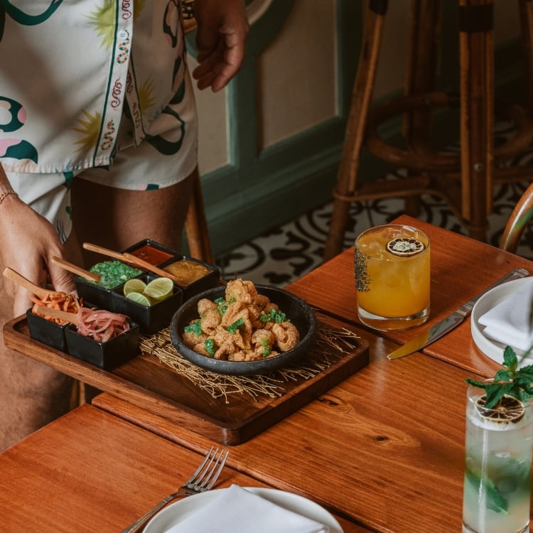 Begin with grilled local oysters finished with Champagne beurre blanc, or a Brussels sprouts sope layered with smoked gouda and miso butter. For the main course, enjoy branzino in green leaf with kaffir and Thai basil, and beef short rib birria with ancho chile and a handmade corn tortilla. The evening concludes on a sweet note with a decadent chocolate cazuela, layered with dulce de leche and spiced sugar.